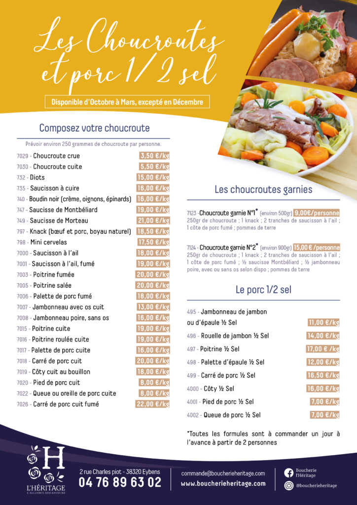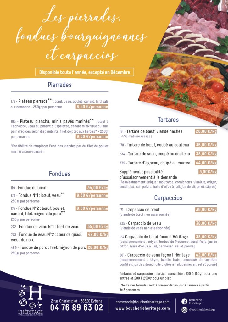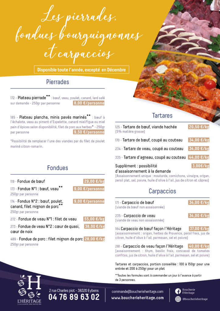PROSPECTUS ET ÉVÉNEMENTS Télécharger Les Choucroutes et porc 1/2 sel Commande et réservation Télécharger "Les Pierrades, fondues bourguignognes et les carpaccios" Commande et réservation Télécharger "Plateau raclette & fondue savoyarde" Commande et réservation Brochure Buffet Voir et télécharger Commande et réservation Brochure BBQ Voir et télécharger Commande et réservation